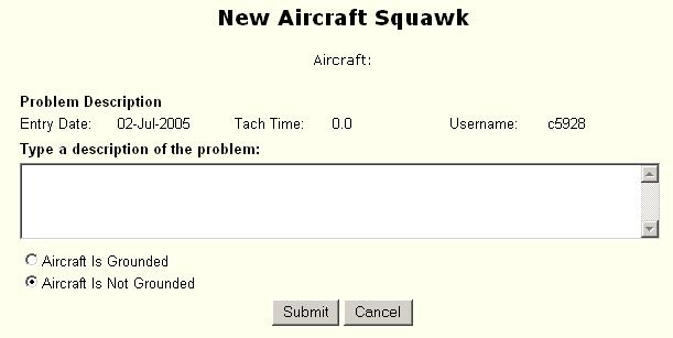 Note: A maintenance form is generated from the squawk information entered along with the entering pilot’s name, address and phone number so that the mechanic may contact the pilot if more information is needed to repair the problem.